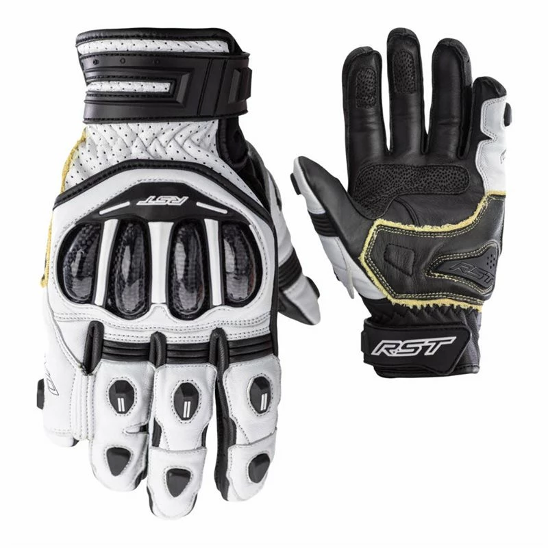 Made with both full-grain cowhide and kangaroo leather, the glove features a CE Level 1 Carbon Knuckle Protector for impact protection. DuPontโข Kevlarยฎ Fibre on the palm stitching and underlay, along with double layer kangaroo leather and an RST palm slider protect the palm in the event of a high speed slide. Elasticated conjoined fingers to prevent โfinger rollโ without affecting reach or flexibility when changing gear and the hook & loop closure offers a secure fit.